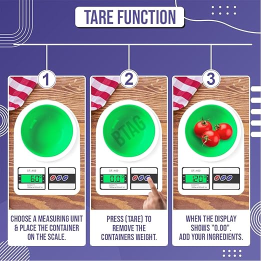 Tare Function: Easily zero out the weight of containers or bowls, so you measure only what you add, making portioning and accuracy simple.