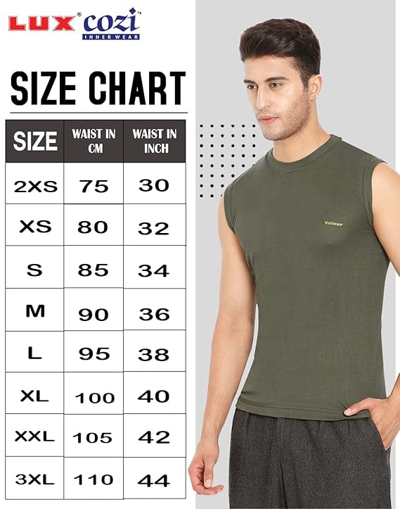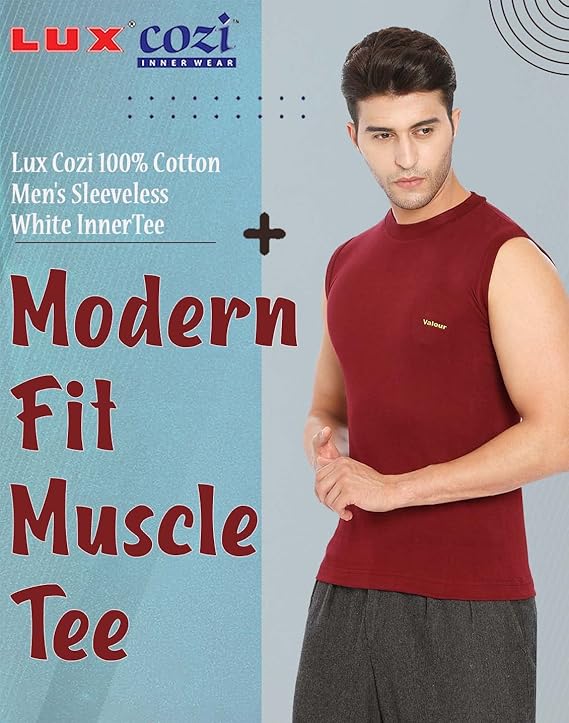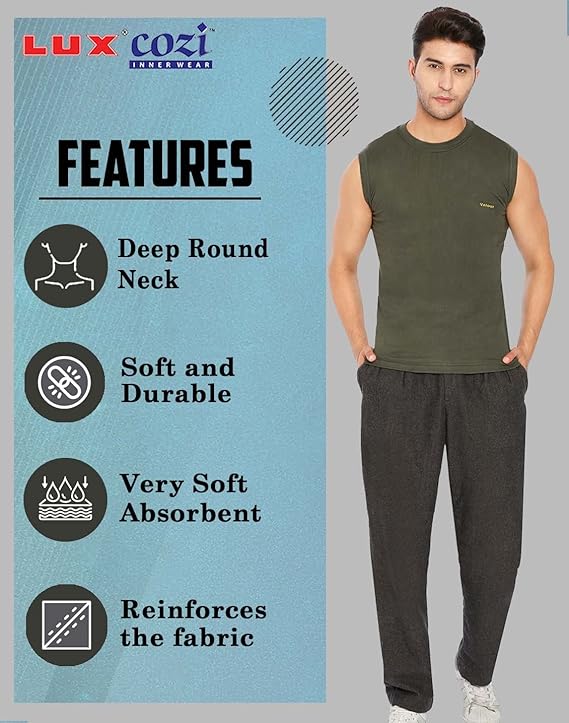 The Lux Cozi 100% Cotton Men's Sleeveless White Inner Tee is designed for superior comfort and breathability. Made from high-quality, 100% pure cotton fabric, this inner tee ensures softness against the skin while providing excellent moisture absorption to keep you dry and fresh throughout the day. Its sleeveless design allows for a full range of motion, making it perfect for layering under shirts, polos, or as casual home wear. The durable construction ensures long-lasting wear, with a snug fit that maintains its shape after multiple washes. Ideal for everyday use, this classic white inner tee combines comfort and style seamlessly.