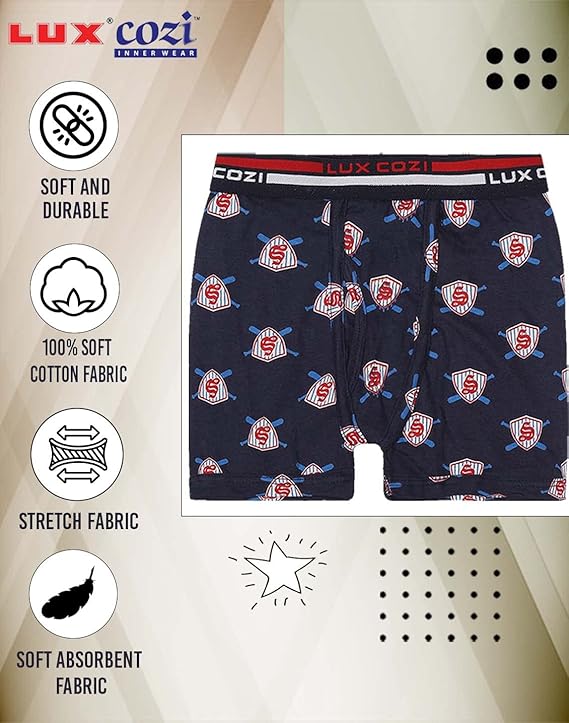These Lux Cozi Boys Outer Elastic Trunks are designed to provide comfort and support for active young boys. Made from a soft, breathable cotton fabric, these trunks offer all-day comfort and flexibility, allowing for free movement during any activity. The outer elastic waistband provides a snug yet gentle fit without causing any irritation to the skin. Available in assorted vibrant colors, these trunks add a fun touch to everyday essentials. Ideal for everyday wear, they maintain shape and comfort, even after multiple washes, making them a reliable addition to any young boy's wardrobe.