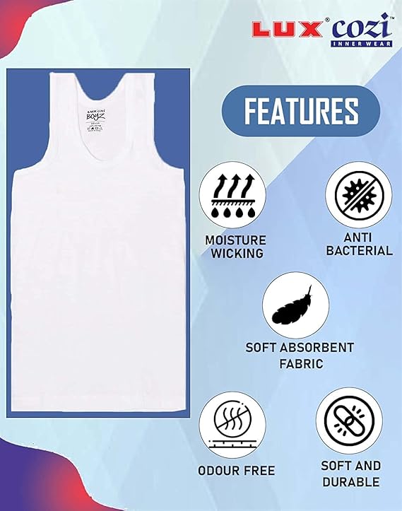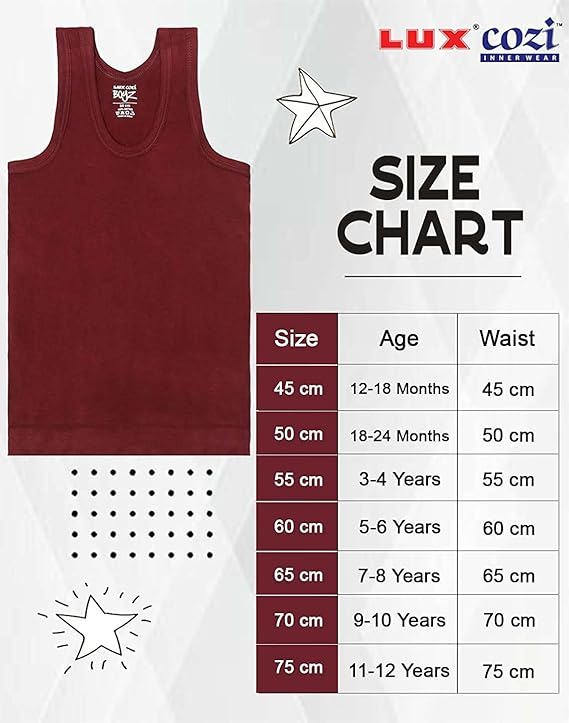 The Lux Cozi Sleeveless Cotton Vest for Boys is designed for comfort, style, and durability, perfect for active young ones. Crafted from premium-quality cotton, this vest is lightweight, breathable, and exceptionally soft on the skin, ensuring your child feels comfortable all day. It features a sleeveless design that allows for easy movement and versatility, making it ideal for layering or wearing alone. The vest is neatly stitched for enhanced durability, holding up well through daily wear and washes. With its comfortable fit and classic design, this vest is a great addition to any boy’s wardrobe for everyday wear, sports, or layering under shirts. Available in various sizes to fit different age groups.