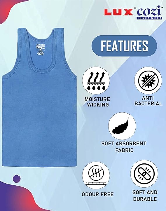 The Lux Cozi Sleeveless Cotton Vest for Boys is designed for comfort, style, and durability, perfect for active young ones. Crafted from premium-quality cotton, this vest is lightweight, breathable, and exceptionally soft on the skin, ensuring your child feels comfortable all day. It features a sleeveless design that allows for easy movement and versatility, making it ideal for layering or wearing alone. The vest is neatly stitched for enhanced durability, holding up well through daily wear and washes. With its comfortable fit and classic design, this vest is a great addition to any boy’s wardrobe for everyday wear, sports, or layering under shirts. Available in various sizes to fit different age groups.