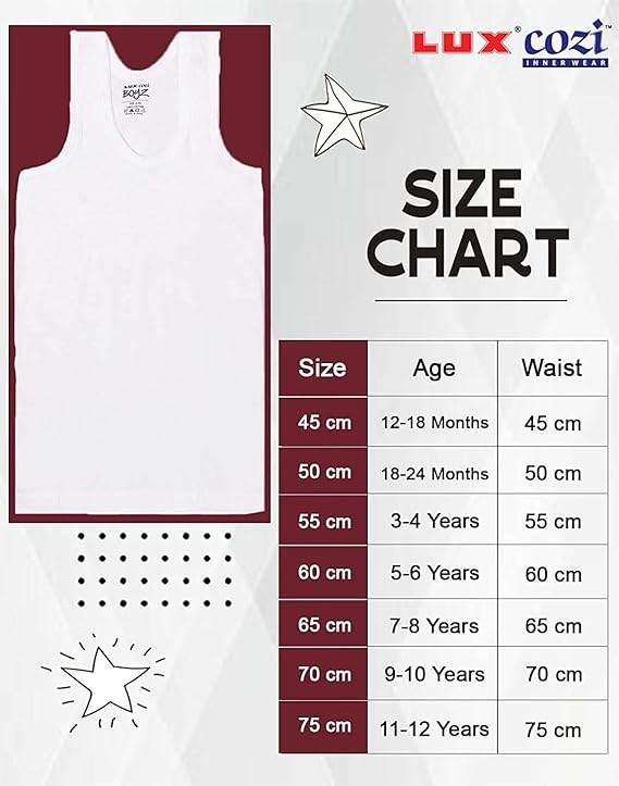 The Lux Cozi Sleeveless Cotton Vest for Boys is designed for comfort, style, and durability, perfect for active young ones. Crafted from premium-quality cotton, this vest is lightweight, breathable, and exceptionally soft on the skin, ensuring your child feels comfortable all day. It features a sleeveless design that allows for easy movement and versatility, making it ideal for layering or wearing alone. The vest is neatly stitched for enhanced durability, holding up well through daily wear and washes. With its comfortable fit and classic design, this vest is a great addition to any boy’s wardrobe for everyday wear, sports, or layering under shirts. Available in various sizes to fit different age groups.